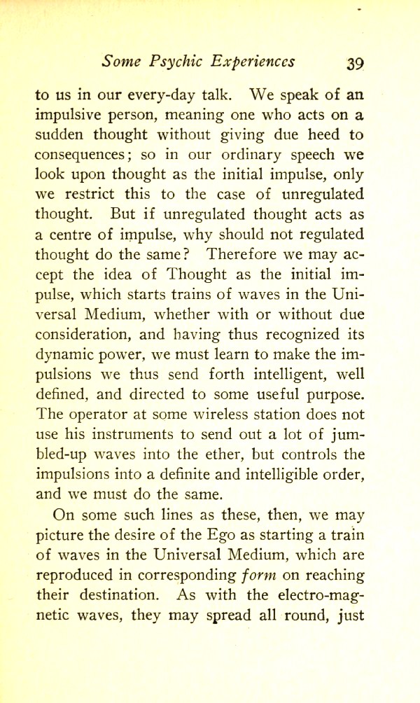 On some such lines as these, then, we may picture the desire of the Ego as starting a train of waves in the Universal Medium, which are reproduced in corresponding form or reaching their destination. As with the electromagnetic waves, they may spread all around, just