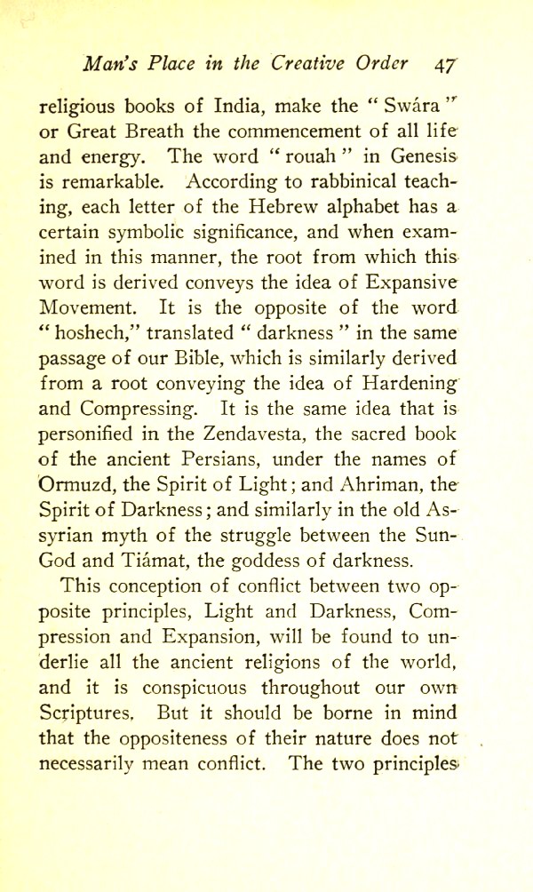 The word rouah in Genesis is remarkable. According to rabbinical teaching, each letter of the Hebrew alphabet has a certain symbolic significance, and when examined in this manner, the root from which this word is derived conveys the idea of Expansive Movement. It is the opposite of the word hoshech, translated "darkness" in the same passage of our Bible, which is similarly derived from a root conveying the idea of Hardening and Compressing. It is the same idea that is personified in the Zend-avesta, the sacred book of the Persians, under the names of Ormuzd, the Spirit of Light, and Ahriman, the Spirit of darkness; and similarly in the old Assyrian myth of the struggle between the Sun-God and Tiamat, the goddess of darkness.