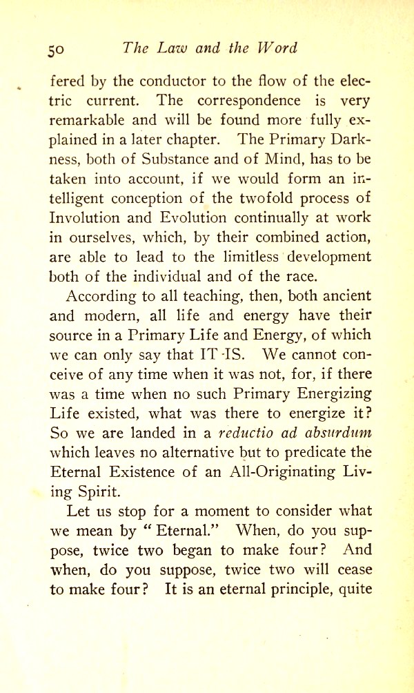 According to all teaching, then, both ancient and modern, all life and energy have their source in a Primary Life and Energy, of which we can only say that IT IS. We cannot conceive of any time when it was not --- for, if there was a time when no such Primary Energising Life Existed, what was there to energise it? So we are landed in a reductio ad absurdum which leaves no alternative but to predicate the Eternal Existence of an All-Originating Living Spirit.