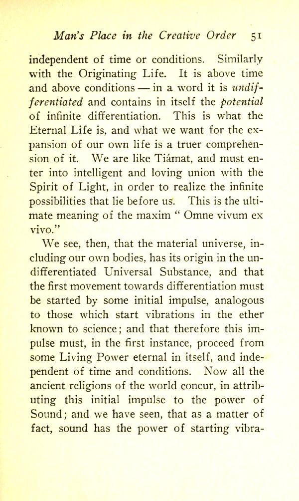 We see, then, that the material universe, including our own bodies, has its origin in the undifferentiated Universal Substance, and that the first movement towards differentiation must be started by some initial impulse, analogous to those which start vibrations in the ether known to science; and that therefore this impulse must, in the first instance, proceed from some Living Power internal in Itself, and independent of time and conditions. Now all the ancient religions of the world concur in attributing this initial impulse to the power of Sound; and we have seen that as a matter of fact, sound has the power of starting