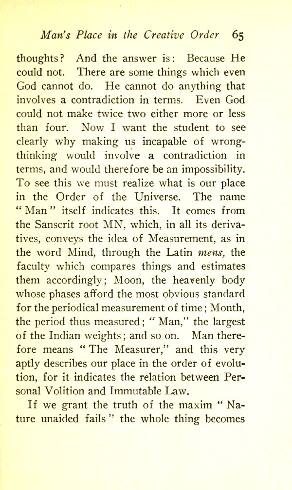 The name Man itself indicates this. It comes from the Sanskrit root MN which, in all its derivatives, conveys the idea of Measurement, as in the word Mind, through the Latin mens, the faculty which compares things and estimates them accordingly; Moon, the heavenly body whose phases afford the most obvious standard for the periodical measurement of time; Month, the period thus measured; Man, the largest of the Indian weights; and so on. Man therefore means "the measurer", and this very aptly describes our place in the order of evolution, for it indicates the relation between Personal Volition and Immutable Law.