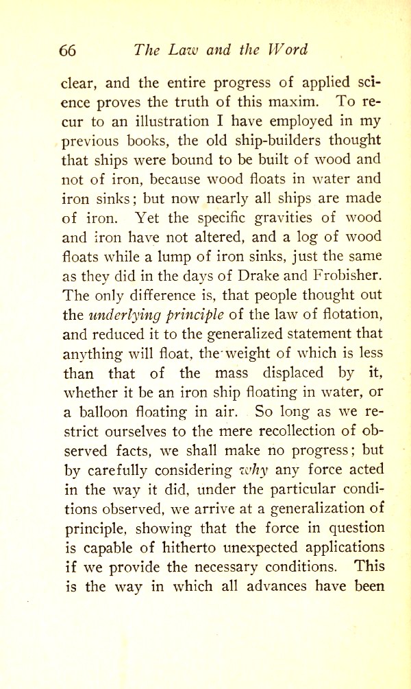 clear, and the entire progress of applied science proves the truth of this maxim. To recur to an illustration I have employed in my previous books, the old ship-builders thought that ships were bound to be built of wood and not of iron, because wood floats in water and iron sinks; but now nearly all ships are made of iron. Yet the specific gravities of wood and iron have not altered, and a log of wood floats while a lump of iron sinks, just as they did in the days of Drake and Frobisher. The only difference is that people thought out the underlying principle of the law of flotation and reduced it to the generalised statement that anything will float the weight of which is less than that of the mass displaced by it, whether it be an iron ship floating in water or a balloon floating in air.