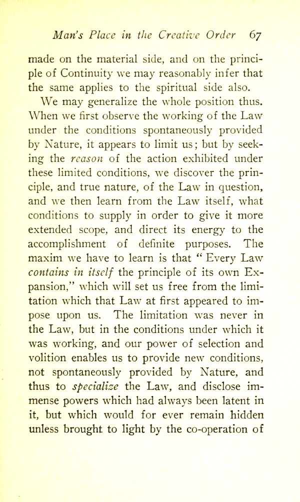 The maxim we have to learn is that "Every Law contains in itself the principle of its own Expansion", which will set us free from the limitation which that Law at first appeared to impose upon us. The limitation was never in the Law but in the conditions under which it was working, and our power of selection and volition enables us to provide new conditions not spontaneously provided by Nature, and thus to specialize the Law and disclose immense powers which had always been latent in it, but which would forever remain hidden unless brought to light by the co-operation of