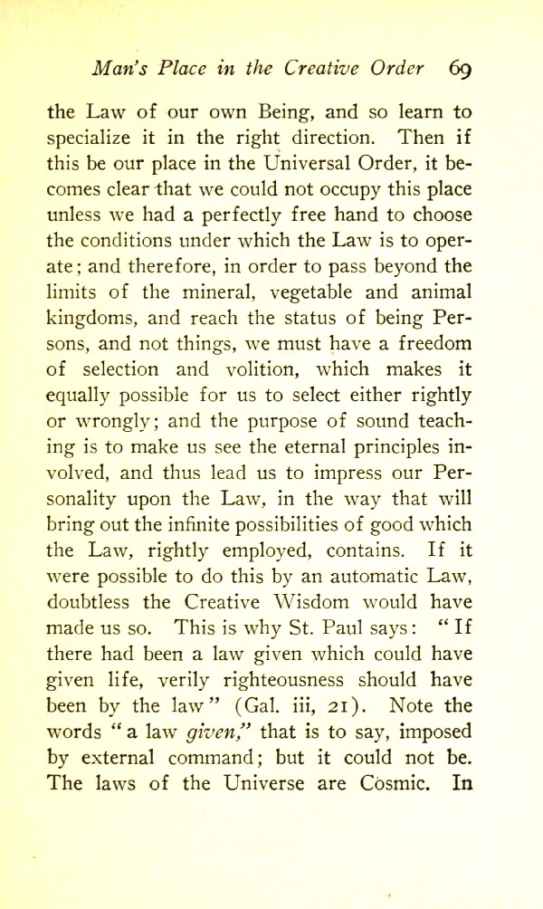 the Law of our own Being and so learn to specialise it in the right direction. Then if this be our place in the Universal Order, it becomes clear that we could not occupy this place unless we had a perfectly free hand to choose the conditions under which the Law id to operate; and therefore, in order to pass beyond the limits of the mineral, vegetable, and animal kingdoms and reach the status of being Persons and not things, we must have a freedom of selection and volition which makes it equally possible for us to select either rightly or wrongly; and the purpose of sound teaching is to make us see the eternal principles involved and thus lead us to impress our Personality upon the Law in the way that will bring out the infinite possibilities of good which the Law, rightly employed, contains.