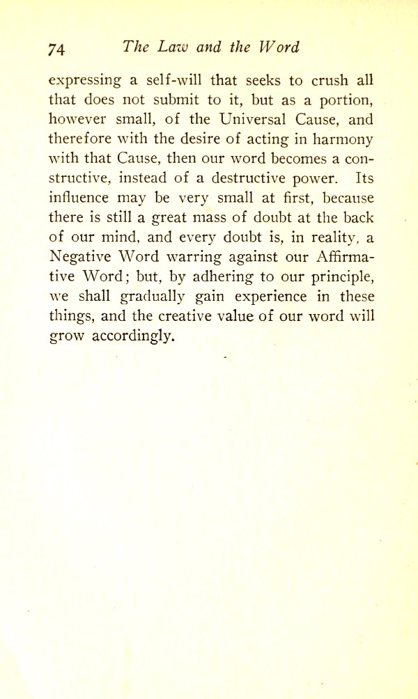 expressing a self-will that seeks to crush all that does not submit to it, but as a portion, however small, of the Universal Cause, and therefore with the desire of acting in harmony with that Cause --- then our word becomes a constructive, instead of a destructive, power. Its influence may be very small at first, because there is still a great mass of doubt at the back of our mind, and every doubt is, in reality, a Negative Word warring against our Affirmative Word; but, by adhering to our principle, we shall gradually gain experience in these things, and the creative value of our word will grow accordingly.