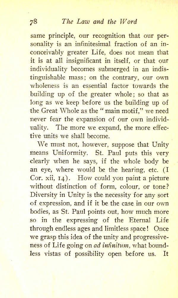 We must not, however, suppose that Unity means Uniformity. St Paul puts this very clearly when he says, if the whole body were an eye, where would be the hearing? etc. (1 Cor. 12:14-26). How could you paint a picture without distinction of form, colour, or tone? Diversity in Unity is the necessity for any sort of expression, and if it be the case in our own bodies, as St Paul points out, how much more so in the expressing of the Eternal Life through endless ages and limitless space! Once we grasp this idea of the unity and progressiveness of Life going on ad infinitum, what boundless vistas of possibility open before us. It