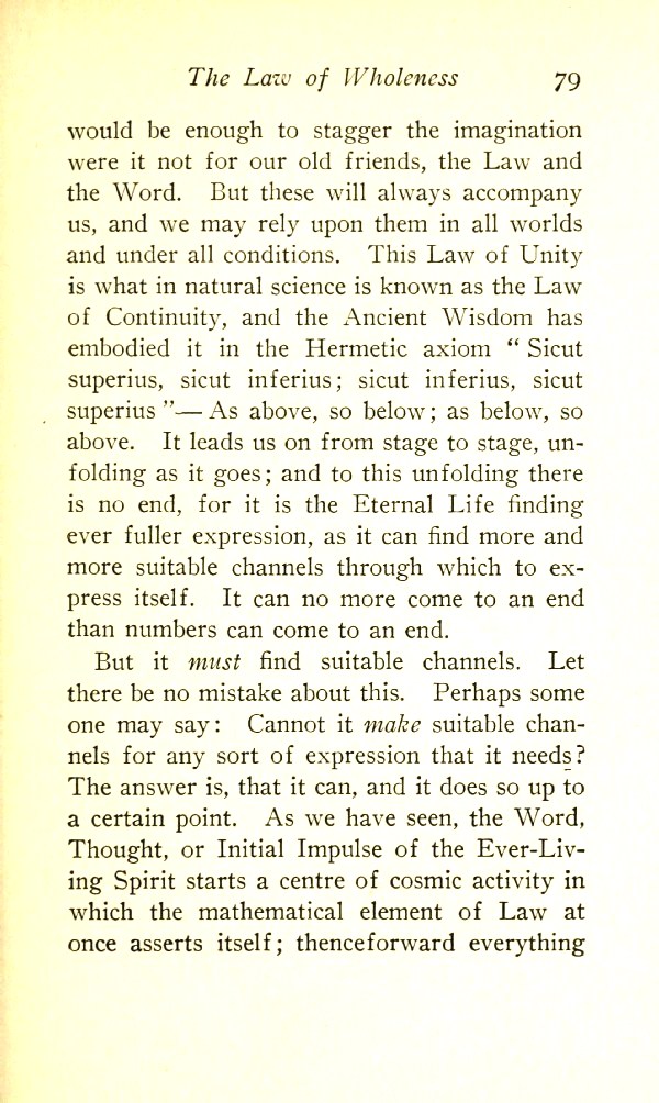 This Law of Unity is what in natural science is known as the Law of Continuity, and the Ancient Wisdom has embodied it in the Hermetic Axiom Sicut superius, sicut inferius; sicut inferius, sicut superius --- "As above, so below; as below, so above". It leads us on from stage to stage, unfolding as it goes; and to this unfolding there is no end, for it is the Eternal Life finding ever fuller expression as it can find more and more suitable channels through which to express itself. It can no more come to an end than numbers can come to an end.