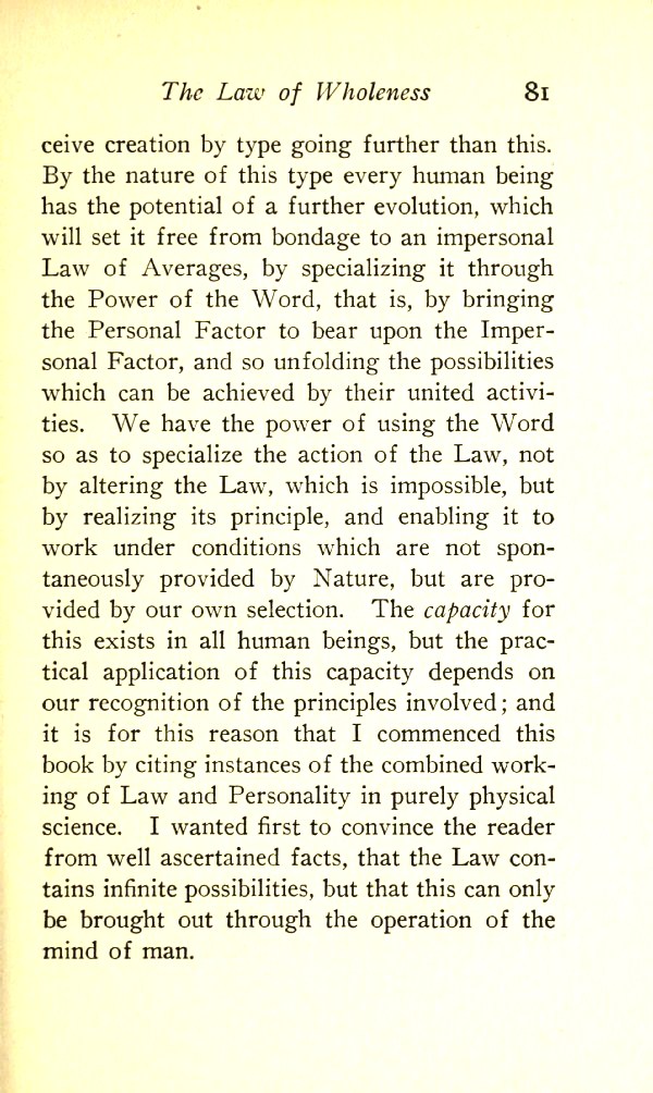 We have the power of using the Word so as to specialise the action of the Law --- not by altering the Law, which is impossible, but by realising its principle and enabling it to work under conditions which are not spontaneously provided by Nature but are provided by our own selection. The capacity for this exists in all human beings, but the practical application of this capacity depends on our recognition of the principles involved; and it is for this reason that I commenced this book by citing instances of the combined working of Law and Personality in purely physical science. I wanted first to convince the reader from well-ascertained facts that the Law contains infinite possibilities, but that this can only be brought out through the operation of the mind of man.