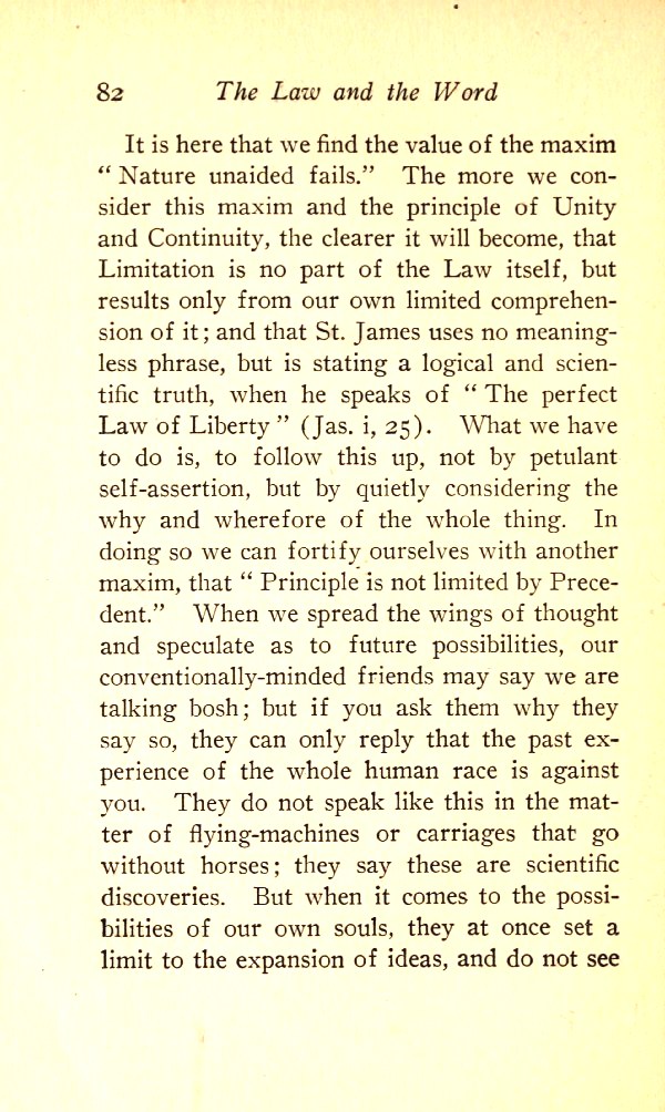 It is here that we find the value of the maxim "Nature unaided fails". The more we consider this maxim and the principle of Unity and Continuity, the clearer it will become that Limitation is no part of the Law itself but results only from our own limited comprehension of it, and that St James uses no meaningless phrase but is stating a logical and scientific truth when he speaks of "The perfect Law of Liberty" (Jas. 1:25). What we have to do is to follow this up, not by petulant self-assertion but by quietly considering the why and wherefore of the whole thing. In doing so, we can fortify ourselves with another maxim, that "Principle is not limited by Precedent".