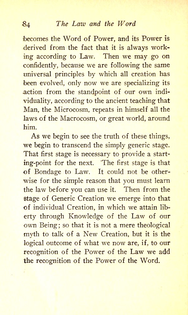 As we begin to see the truth of these things, we begin to transcend the simply generic stage. That first stage is necessary to provide a starting-point for the next. The first stage is that of Bondage to Law. It could not be otherwise, for the simple reason that you must learn the law before you can use it. Then from the stage of Generic Creation we emerge into that of individual Creation, in which we attain liberty through Knowledge of the Law of our own Being; so that it is not a mere theological myth to talk of a New Creation, but it is the logical outcome of what we now are if, to our recognition of the Power of the Law, we add the recognition of the Power of the Word.