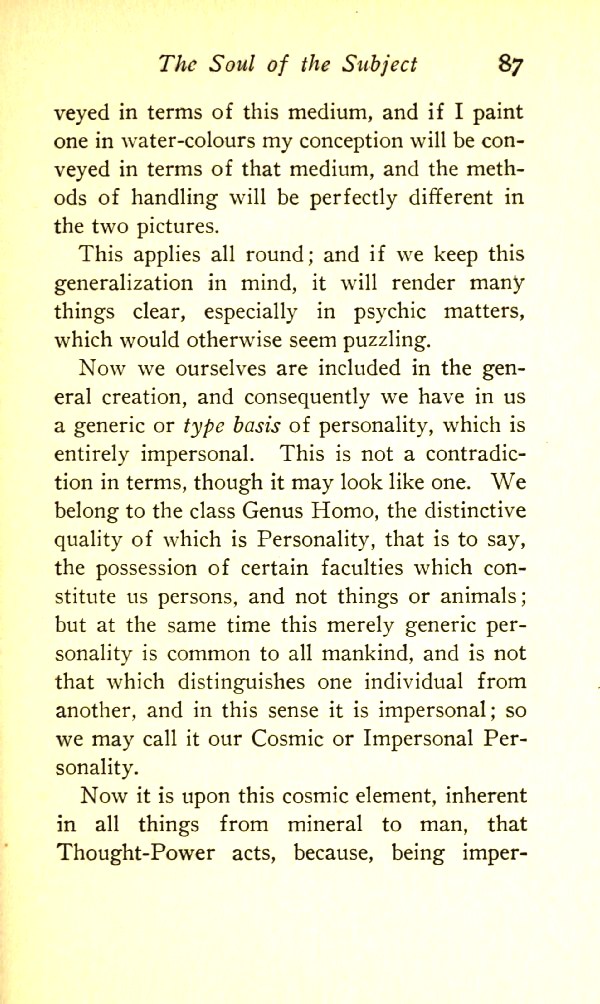 Now we ourselves are included in the general creation, and consequently we have in us a generic or type basis of personality, which is entirely impersonal. This is not a contradiction in terms, though it may look like one. We belong to the class Genus Homo, the distinctive quality of which is Personality --- that is to say, the possession of certain faculties which constitute us persons, and not things or animals; but at the same time this merely generic personality is common to all mankind and is not that which distinguishes one individual from another, and in this sense it is impersonal; so we may call it our Cosmic, or Impersonal, Personality. Now it is upon this cosmic element, inherent in all things from mineral to man, that Thought Power acts because, being