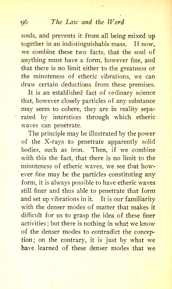 The principle may be illustrated by the power of the X-rays to penetrate apparently solid bodies, such as iron. Then if we combine with this the fact that there is no limit to the minuteness of etheric waves, we see that however fine may be the particles constituting any form, it is always possible to have etheric waves still finer, and thus able to penetrate that form and set up vibrations in it.
