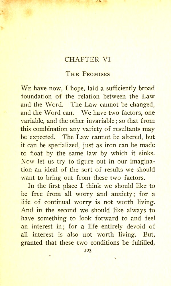 We have now, I hope, laid a sufficiently broad foundation of the relation between the Law and the Word. The Law cannot be changed, and the Word can. We have two factors, one variable and the other invariable; so that from this combination any variety of resultants may be expected. The Law cannot be altered, but it can be specialised, just as iron can be made to float by the same law by which it sinks. Now let us try to figure out in our imagination an ideal of the sort of results we should want to bring out from these two factors. In the first place, I think we should like to be free from all worry and anxiety; for a life of continual worry is not worth living. And in the second, we should like always to have something to look forward to and feel an interest in; for a life entirely devoid of all interest is also not worth living. But, granted that these two conditions be fulfilled,