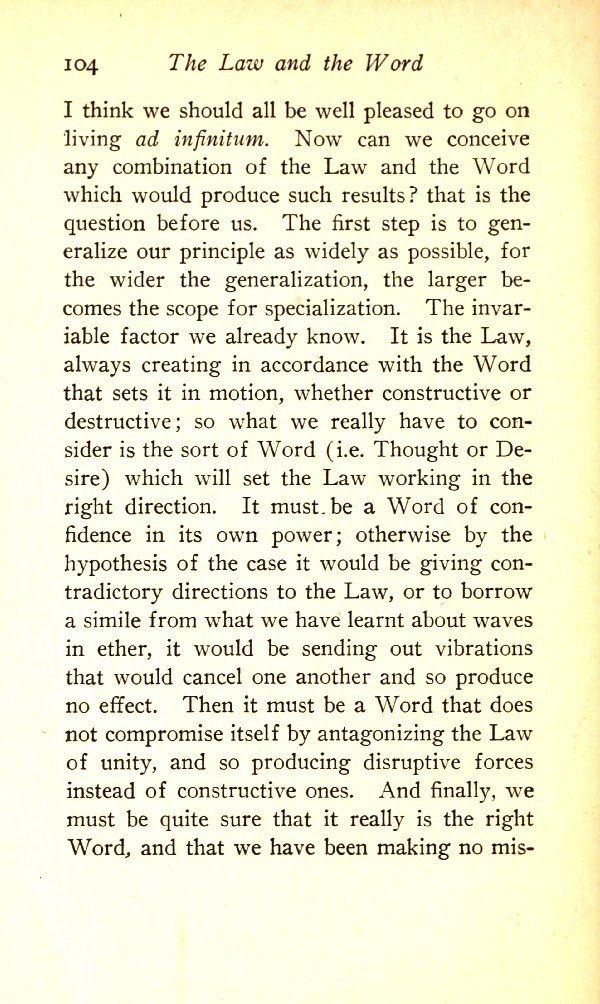 It must be a Word of confidence in its own power; otherwise by the hypothesis of the case it would be giving contradictory directions to the Law --- or, to borrow a simile from what we have learnt about waves in ether, it would be sending out vibrations that would cancel one another and so produce no effect. Then it must be a Word that does not compromise itself by antagonising the Law of Unity, and so producing disruptive forces instead of constructive ones. And finally, we must be quite sure that it really is the right Word, and that we have been making no