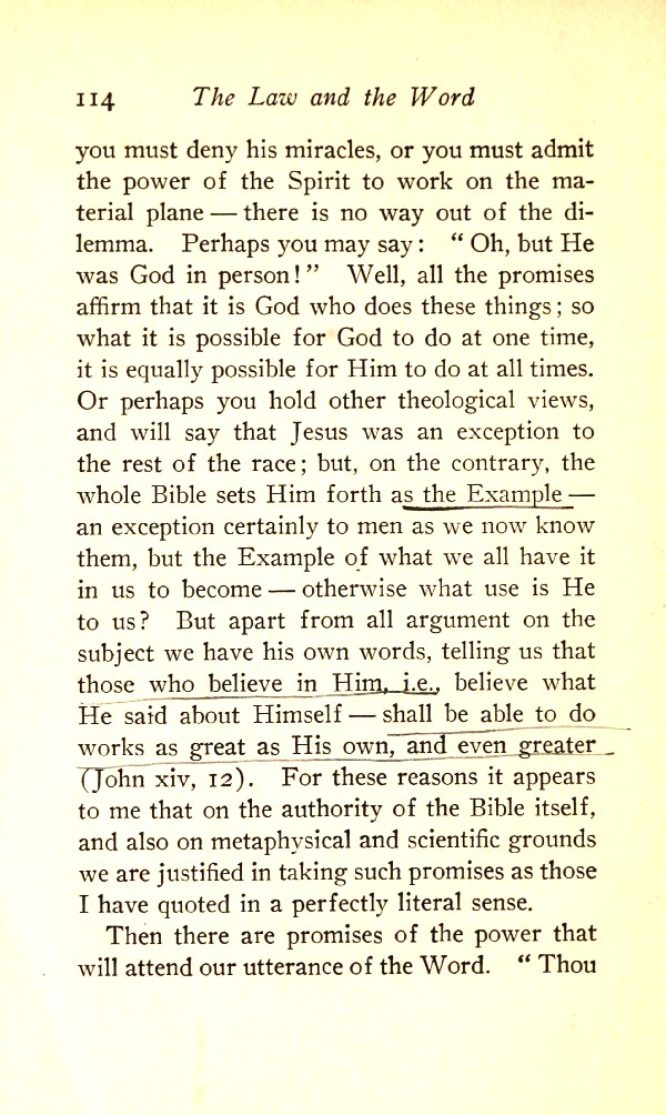 But apart from all argument on the subject, we have his own words telling us that those who believe in him --- i.e. believe what he said about himself --- shall be able to do works as great as his own, and even greater (John 14:12). For these reasons it appear to me that on the authority of the Bible itself, and also on metaphysical and scientific grounds, we are justified in taking such promises as those I have quoted in a perfectly literal sense.