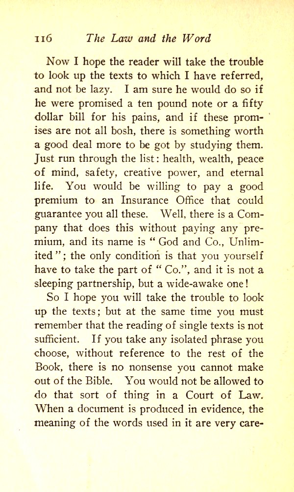 Now I hope the reader will take the trouble to look up the texts to which I have referred and not be lazy. I am sure he would do so if he were promised a ten-pound note or a fifty-dollar bill for his pains, and if these promises are not all bosh, there is something worth a good deal more to be got by studying them. Just run through the list: health, wealth, peace of mind, safety, creative power, and eternal life. You would be willing to pay a good premium to an Insurance Office that would guarantee you all these. Well, there is a Company that does this without your paying any premium, and its name is "God and Co., Unlimited"; the only condition is that you yourself have to take the part of "Co.", and it is not a sleeping partnership but a wide-awake one! So I hope you will take the trouble to look up the texts; but at the same time you must remember that the reading of single texts is not sufficient. If you take any isolated phrase you choose, without reference to the rest of the Book, there is no nonsense you cannot make out of the Bible. You would not be allowed to do that sort of thing in a Court of Law. When a document is produced in evidence, the meanings of the words used in it are very carefully