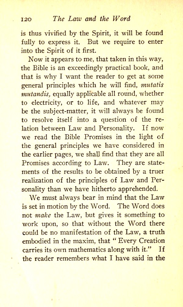 Now it appears to me that, taken in this way, the Bible is an exceedingly practical book, and that is why I want the reader to get at some general principles which he will find, mutatis mutandis, equally applicable all round, whether to electricity or to life; and whatever may be the subject matter, it will always be found to resolve itself into a question of the relation between Law and Personality. If now we read the Bible Promises in the light of the general principles we have considered in the earlier pages, we shall find that they are all Promises according to Law. They are statements of the results to be obtained by a truer realisation of the principles of Law and Personality than we have hitherto apprehended.