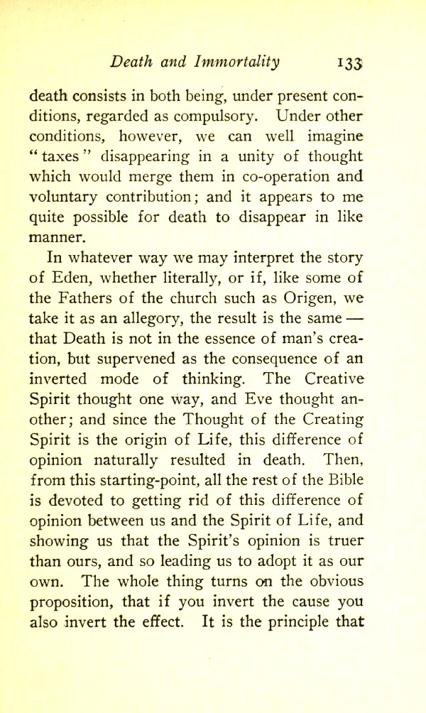 I think most of my readers will agree with me that the greatest of all promises is that of the overcoming of death for, as the greater includes the less, the power which can do that can do anything else. We think that there are only two things that are certain in this world --- death and taxes; and no doubt, under the ordinary past conditions, this is quite true; but the question is: Are they really inherent in the essential nature of things; or are they not the outcome of our past limited, and often inverted, modes of Thought? The teaching of the Bible is that they are the latter. On the subject of taxes, the Master says: "Render unto Caesar the things that are Caesar's" (Matt. 22:21), but on another occasion he said that the children of the King were not liable to taxation (Matt. 17:26). However, we may leave the "taxes" alone for the present, with the remark that their resemblance to