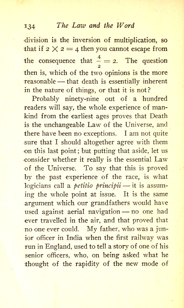 To say that this is proved by the past experience of the race is what logicians call a petitio principii --- it is assuming the whole point at issue. It is the same argument which our great-grandfathers would have used against aerial navigation --- no one had ever travelled in the air, and that proved that no one ever could. My father, who was a junior officer in India when the first railway was run in England, used to tell a story of one of his senior officers who, on being asked what he thought of the rapidity of the new mode of