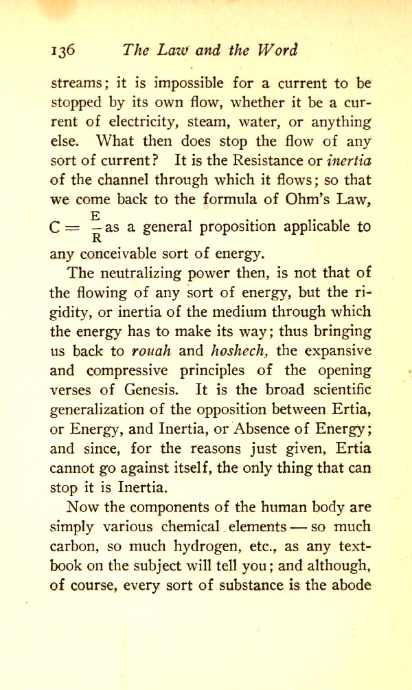 The neutralising power, then, is not that of the flowing of any sort of energy, but the rigidity, or inertia, of the medium through which the energy has to make its way, thus bringing us back to rouah and hoshech, the expansive and compressive principles of the opening verses of Genesis. It is the broad scientific generalisation of the opposition between Ertia, or Energy, and Inertia, or Absence of Energy; and since, for the reasons just given, Ertia cannot go against itself, the only thing that can stop it is Inertia.