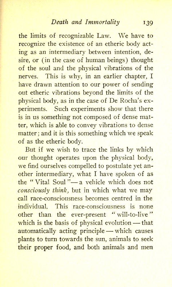 But if we wish to trace the links by which our thought operates upon the physical body, we find ourselves compelled to postulate yet another intermediary, what I have spoken of as the "Vital Soul" --- a vehicle which does not consciously think, but in which what we may call race consciousness becomes centred in the individual. This race consciousness is none other than the ever-present "will to live" which is the basis of physical evolution --- that automatically acting principle which causes plants to turn towards the sun, animals to seek their proper food, and both animals and men