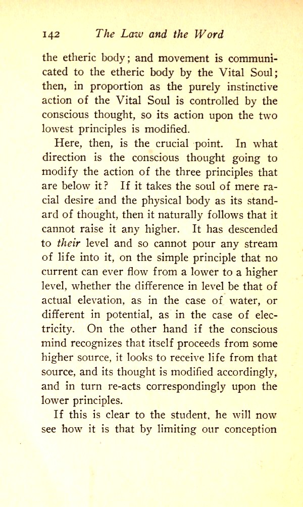 Here, then, is the crucial point. In what direction is the conscious thought going to modify the action of the three principles that are below it? If it takes the soul of mere racial desire and the physical body as its standard of thought, then it naturally follows that it cannot raise it any higher. It has descended to their level and so cannot pour any stream of life into it on the simple principle that no current can flow from a lower to a higher level, whether the difference in level be that of actual elevation, as in the case of water, or difference in potential, as in the case of electricity. On the other hand, if the conscious mind recognises that itself proceeds from some higher source and its thought is modified accordingly, then it in its turn reacts correspondingly upon the lower principles.