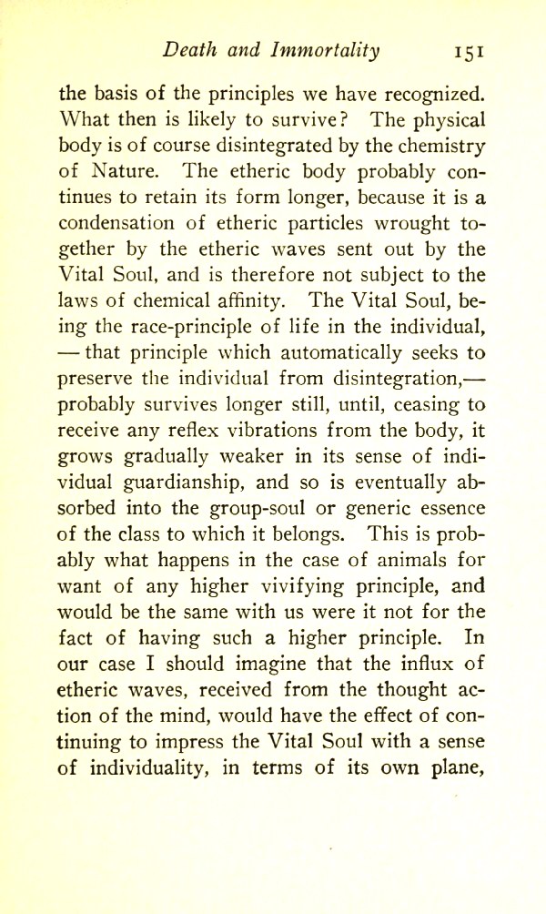 What, then, is likely to survive? The physical body is of course disintegrated by the chemistry of Nature. The etheric body continues to retain its form longer, because it is a condensation of etheric particles wrought together by the etheric waves sent out by the Vital Soul and is therefore not subject to the laws of chemical affinity. The Vital Soul, being the race principle of life in the individual --- that principle which automatically seeks to preserve the individual from disintegration --- probably survives longer still until, ceasing to receive any reflex vibrations from the body, it grows gradually weaker in its sense of individual guardianship and so is eventually absorbed into the group soul or generic essence of the class to which it belongs.
