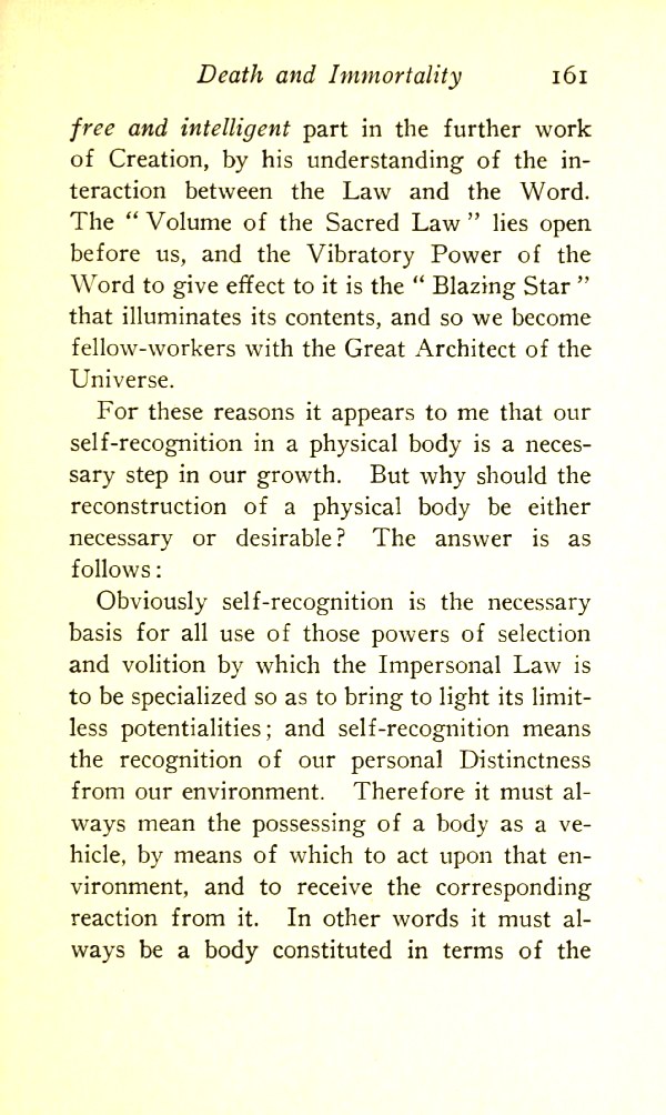 Obviously, self-recognition is the necessary basis for all use of those powers of selection and volition by which the Impersonal Law is to be specialised so as to bring to light its limitless possibilities; and self-recognition means the recognition of our personal Distinctness from our environment. Therefore it must always mean the possessing of a body as a vehicle by means of which to act upon that environment and to receive the corresponding reaction from it. In other words, it must always be a body constituted in terms of the