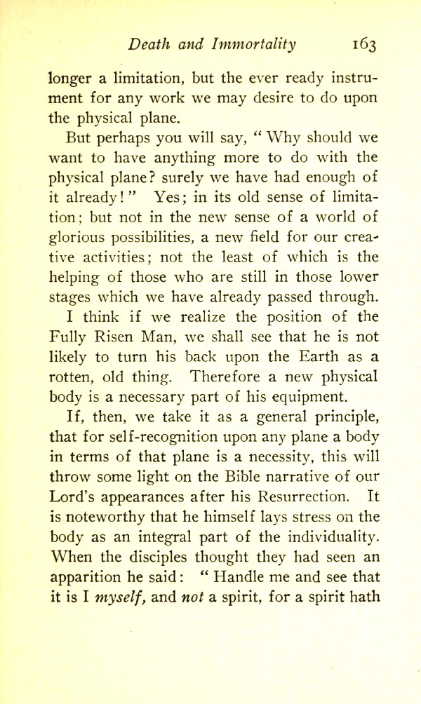 If, then, we take it as a general principle that for self-recognition upon any plane, a body in terms of that plane is a necessity, this will throw some light on the Bible narrative of Jesus' appearances after his resurrection. It is noteworthy that he himself lays stress on the body as an integral part of the individuality. When the disciples thought they had seen an apparition, he said: "Handle me and see that it is I myself, and not a spirit, for a spirit hath