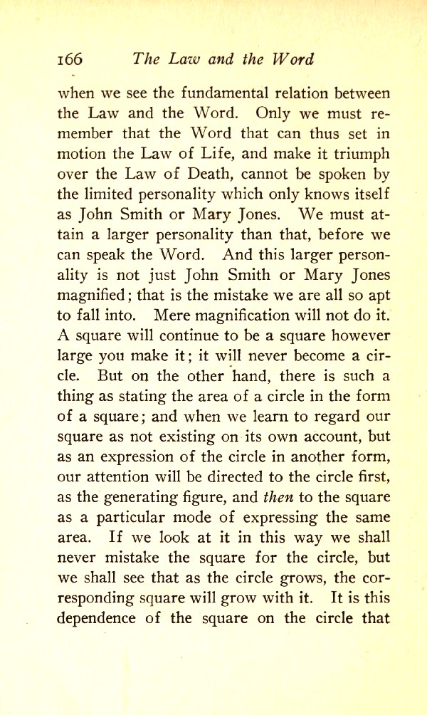when we see the fundamental relation between the Law and the Word. Only we must remember that the Word that can thus set in motion the Law of Life and make it triumph over the Law of Death cannot be spoken by the limited personality which only knows itself as John Smith or Mary Jones. We must attain a larger personality than that before we can speak the Word. And this larger personality is not just John Smith or Mary Jones magnified; that is the mistake we are all so apt to fall into. Mere magnification will not do it.