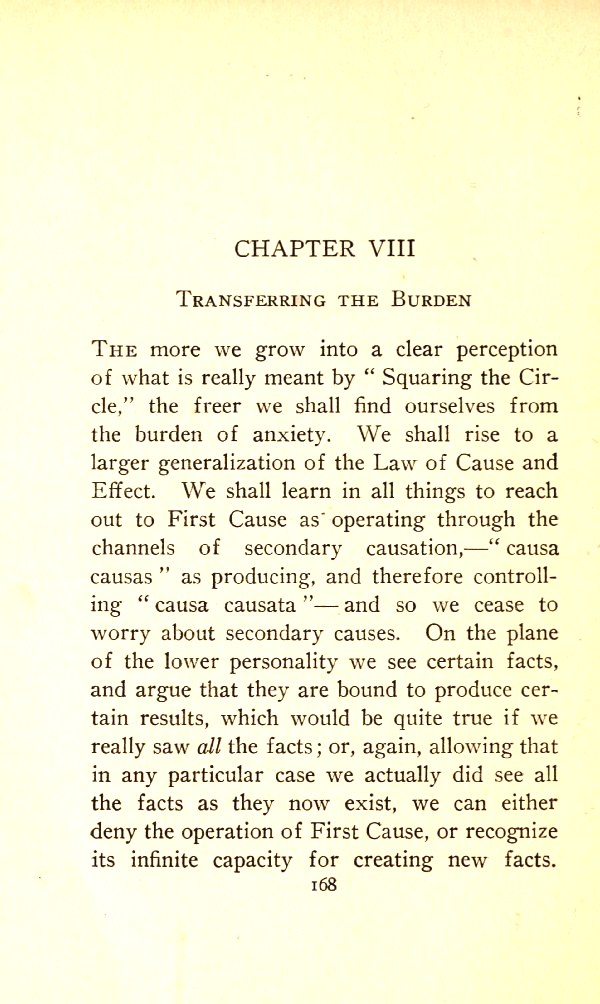 The more we grow into a clear perception of what is really meant by "Squaring the Circle", the freer we shall find ourselves from the burden of anxiety. We shall rise to a larger generalisation of the Law of Cause and Effect. We shall learn in all things to reach out to First Cause as operating through the channels of secondary causation --- causa causans as producing, and therefore controlling, causa causata --- and so we cease to worry about secondary causes. On the plane of the lower personality we see certain facts and argue that they are bound to produce certain results, which would be quite true if we really saw all the facts; or, again, allowing that in any particular case we actually did see all the facts as they now exist, we can either deny the operation of First Cause or recognise its infinite capacity for creating new facts.