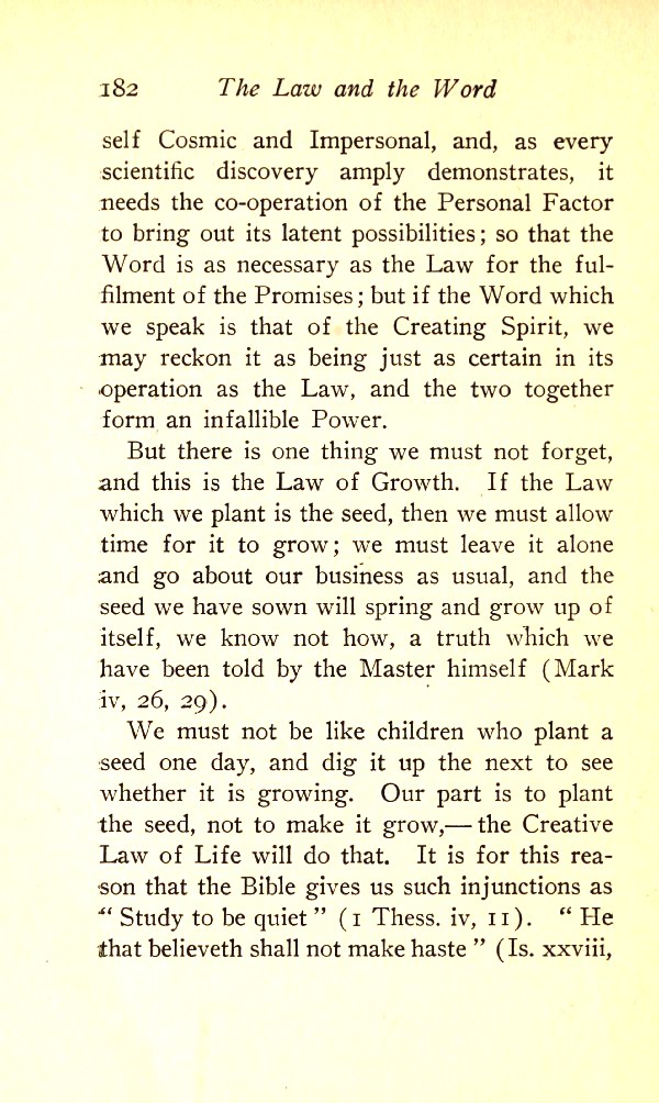 But there is one thing we must not forget, and this is the Law of Growth. If the Word which we plant is the seed, then we must allow time for it to grow; we must leave it alone and go about our business as usual, and the seed we have sown will spring and grow up of itself, we know not how --- a truth we have been told by the Master himself (Mark 4:26-29). We must not be like children who plant a seed one day and dig it up the next to see whether it is growing. Our part is to plant the seed, not to make it grow --- the Creative Law of Life will do that. It is for this reason that the Bible gives us such injunctions as "Study to be quiet" (1 Thess, 4:11); "He that believeth shall not make haste" (Is. 28:16);