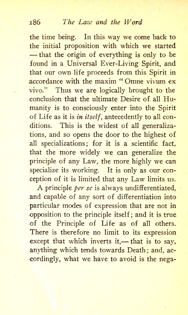 Thus we are logically brought to the conclusion that the ultimate Desire of all Humanity is to consciously enter into the Spirit of Life as it is in itself, antecedently to all conditions. This is the widest of all generalisations; for it is a scientific fact that the more widely we can generalise the principle of any Law, the more highly we can specialise its working. It is only as our conception of it is limited that any Law limits us.