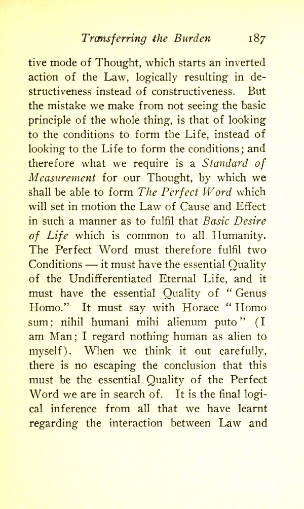 But the mistake we make from not seeing the basic principle of the whole thing is that of looking to the conditions to form the Life, instead of looking to the Life to form the conditions; and therefore what we require is a Standard of Measurement for our Thought by which we shall be able to form The Perfect Word which will set in motion the Law of cause and Effect in such a manner as to fulfil that Basic Desire of Life which is common to all humanity. The Perfect Word must therefore fulfil two Conditions: it must have the essential Quality of the Undifferentiated Eternal Life, and it must have the essential Quality of "Genus Homo". It must say with Horace, Homo sum; nihil humani mihi alienum puto ("I am Man; I regard nothing human as alien to myself"). When we think it out carefully, there is no escaping the conclusion that this must be the essential Quality of the Perfect Word we are in search of. It is the final logical inference from all that we have learnt regarding the interaction between Law and