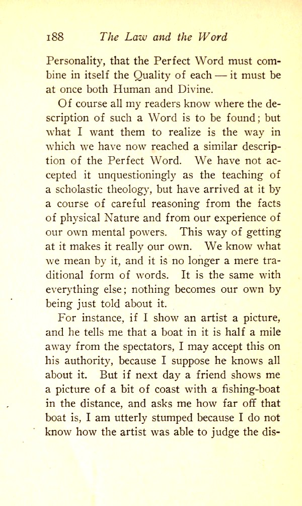 Of course all my readers know where the description of such a Word is to be found; but what I want them to realise is the way in which we have now reached a similar description of the Perfect Word. We have not accepted it unquestioningly as the teaching of a scholastic theology but have arrived at it by a course of careful reasoning from the facts of physical Nature and from our experience of our own mental powers. This way of getting at it makes it really our own. We know what we mean by it, and it is no longer a mere traditional form of words. It is the same with everything else; nothing becomes our own just by being told about it.