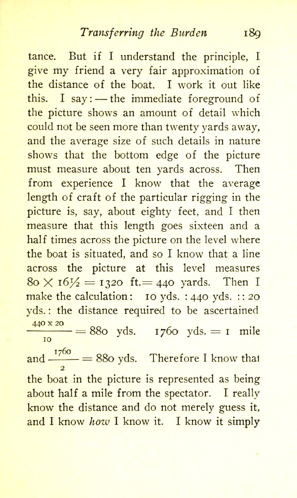 I say: the immediate foreground of the picture shows an amount of detail which could not be seen more than 20 yards away, and the average size of such details in nature shows that the bottom edge of the picture must measure about 10 yards across. Then from experience I know that the average length of craft of the particular rigging in the picture is, say, about 80 feet, and I then measure that this length goes 161/2 times across the picture on the level where the boat is situated, and so I know that a line across the picture at this level measures 80 * 161/2 = 1320 feet = 440 yards.