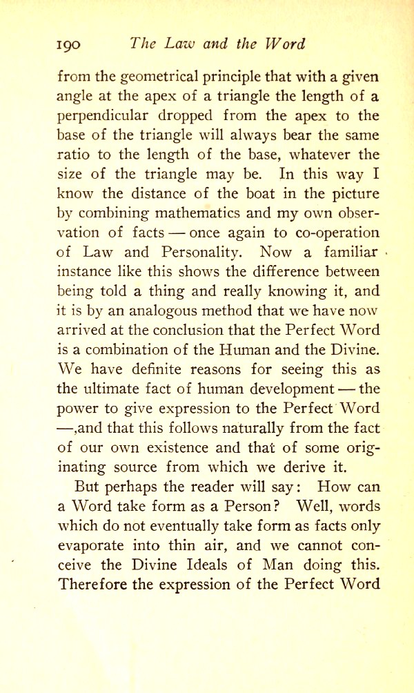 Now a fundamental instance like this shows the difference between being told a thing and really knowing it, and it is by an analogous method that we have now arrived at the conclusion that the Perfect Word is a combination of the Human and the Divine. We have definite reasons for seeing this as the ultimate fact of human development --- the power to give expression to the Perfect Word --- and that this follows naturally from the fact of our own existence and that of some originating source from which we derive it.