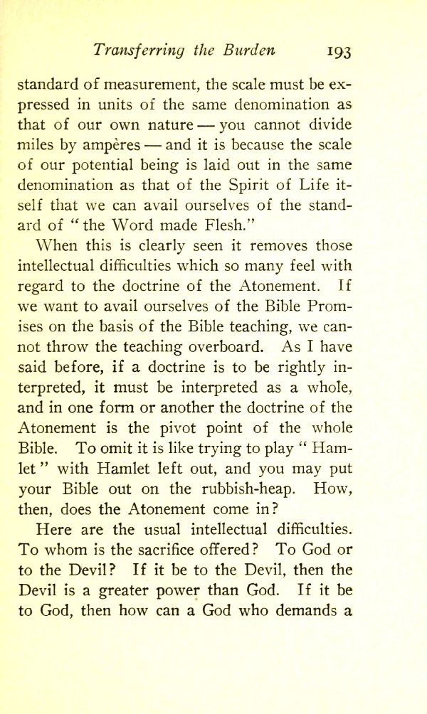 When this is clearly seen, it removes those intellectual difficulties which so many feel with regard to the doctrine of the Atonement. If we want to avail ourselves of the Bible Promises on the basis of the Bible teaching, we cannot throw the teaching overboard. As I have said before, if a doctrine is to be rightly interpreted, it must be interpreted as a whole, and in one form or another the doctrine of the Atonement is the pivot point of the whole Bible. To omit it is like trying to play "Hamlet" with Hamlet left out, and you may put your Bible out on the rubbish heap. How, then, does the Atonement come in? Here are the usual intellectual difficulties. To whom is the sacrifice offered --- to God or to the Devil? If it be to the Devil, then the Devil is a greater power than God. If it be to God, then how can a God Who demands a