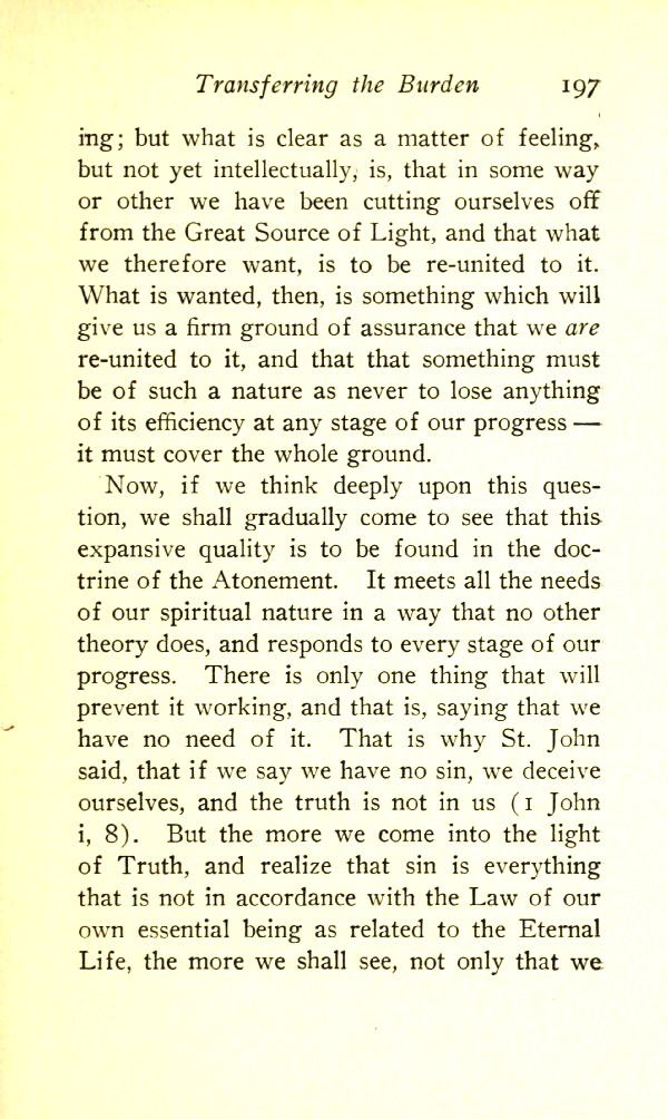 Now if we think deeply upon this question, we shall gradually come to see that this expansive quality is to be found in the doctrine of the Atonement. It meets all the needs of our spiritual nature in a way that no other theory does and responds to every stage of our progress. There is only one thing that will prevent it working, and that is, saying that we have no need of it. That is why St John said that if we say we have no sin, we deceive ourselves, and the truth is not in us (John 1:8).