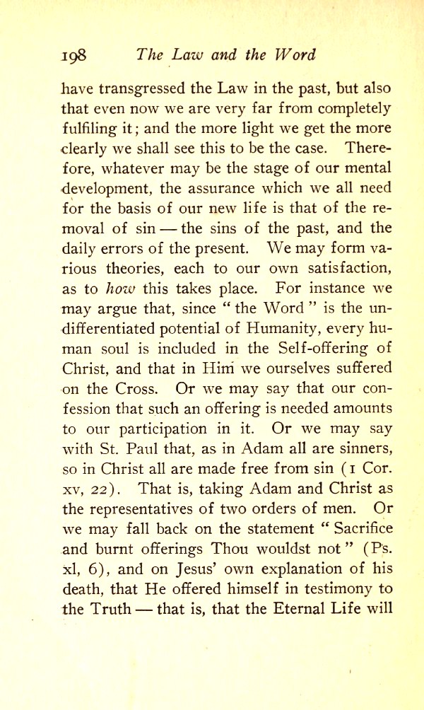 We may form various theories, each to our own satisfaction, as to how this takes place. For instance, we may argue that since "the Word" is the undifferentiated potential of Humanity, every human soul is included in the Self-offering of Christ, and that in him we ourselves suffered on the cross. Or we may say that our confession that such an offering is needed amounts to our particular part in it. Or we may say with St Paul that, as in Adam all are sinners, so in Christ we are all made free from sin (1 Cor. 15:22); that is, taking Adam and Christ as the representatives of two orders of men. Or we may fall back on the statement "Sacrifice and burnt offerings Thou wouldst not" (Ps. 40:6) and on Jesus' own explanation of his death, that he offered himself in testimony of the Truth --- that is, that the Eternal Life will