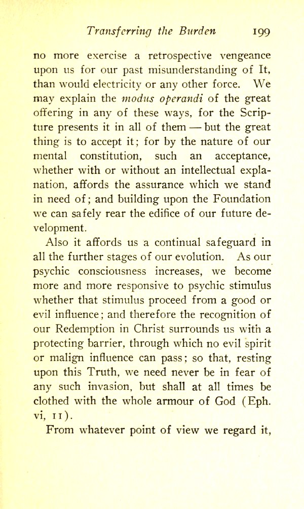 Also it affords us a continual safeguard in all the further stages of our evolution. As our psychic consciousness increases, we become more and more responsive to psychic stimulus, whether that stimulus proceed from a good or evil influence; and therefore our recognition of our Redemption in Christ surrounds us with a protecting barrier through which no evil spirit or malign influence can pass; so that, resting upon this Truth, we need never be in fear of any such invasion but shall at all times be clothed with the whole armour of God (Eph. 6:11).