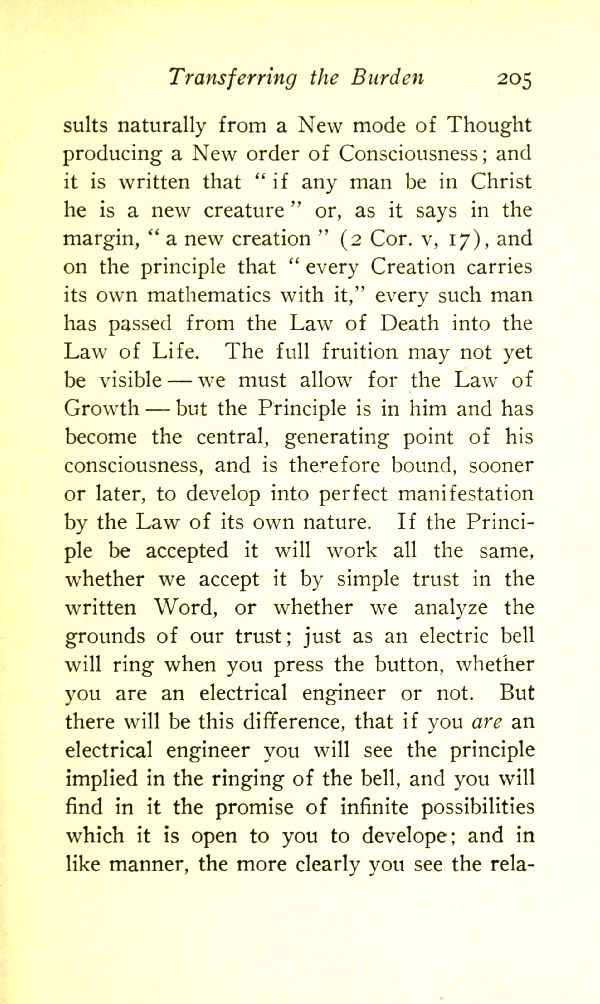 naturally from a New mode of Thought producing a New order of Consciousness; and it is written that "if any man be in Christ he is a new creature", or, as it says in the margin, "a new creation" (2 Cor. 5:17), and on the principle that every Creation carries its own mathematics with it", every such man has passed from the Law of Death into the Law of Life. The full fruition may not yet be visible --- we must allow for the Law of Growth --- but the Principle is in him and has become the central generating point of his consciousness and is therefore bound, sooner or later, to develop into perfect manifestation by the Law of its own nature.