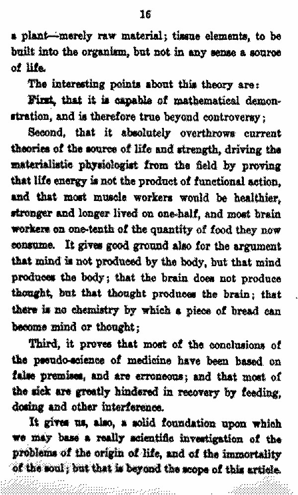 Second, that it absolutely overthrows current theories of the sours of life and strength, driving the materialistic physiologist from the field by proving that life energy is not the product of functional action, and that most muscle workers would be healthier, stronger and longer find on one-half, and most brain workers on one-tenth of the quantity of food they now consume. It gives good ground also for the argument that mind is not produced by the body, but that mind produces the body; that the brain does not produce thought, but that thought produces the brain; that there is no chemistry by which a piece of bread can become mind or thought;