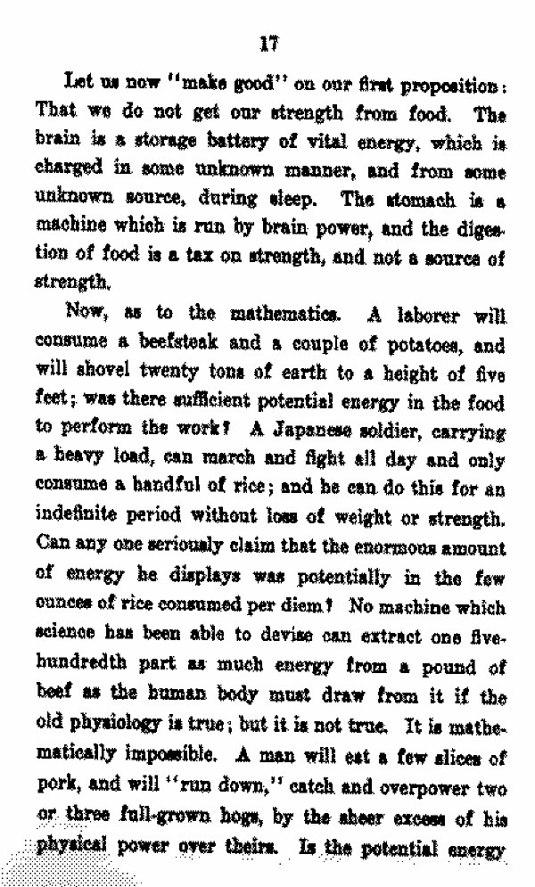 Can any one seriously claim that the enormous amount of energy he displays was potentially in the few ounces at rice consumed per diem? No machine which science has been able to devise can extract one five-hundredth part as much energy from a pound of beef as the human body must draw from it if the old physiology is true', but it is not true, It is mathematically impossible. A man will eat a few slices of pork, and will "run down," catch and overpower two or three fullgrown hogs by the sheer excess of his physical power over theirs. Is the potential energy