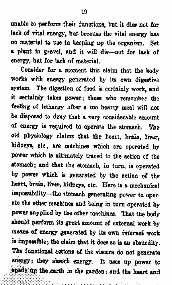Consider for a moment this claim that the body works with energy generated by its own digestive system. The digestion of food is certainly work, and it certainly takes power; those who remember the feeling of lethargy after a too hearty meal will not be disposed to deny that a very considerable amount of energy is required to operate the stomach. The old physiology claims that the heart, brain, liver, kidneys, etc., are machines which are operated by power which is ultimately traced to the action of the stomach; and that the stomach, in turn, is operated by power which is generated by the action of the heart, brain, liver, kidneys, etc. Here is a mechanical impossibility --- the stomach generating power to operate the other machines and being in turn operated by power supplied by the other machines. That the body should perform its great amount of external work by Means of energy generated by its own internal work is impossible; the claim that it does so is an absurdity. The functional actions of the Viscera do not generate energy; they absorb energy. It uses up power to spade up the earth in the garden; and the heart and.