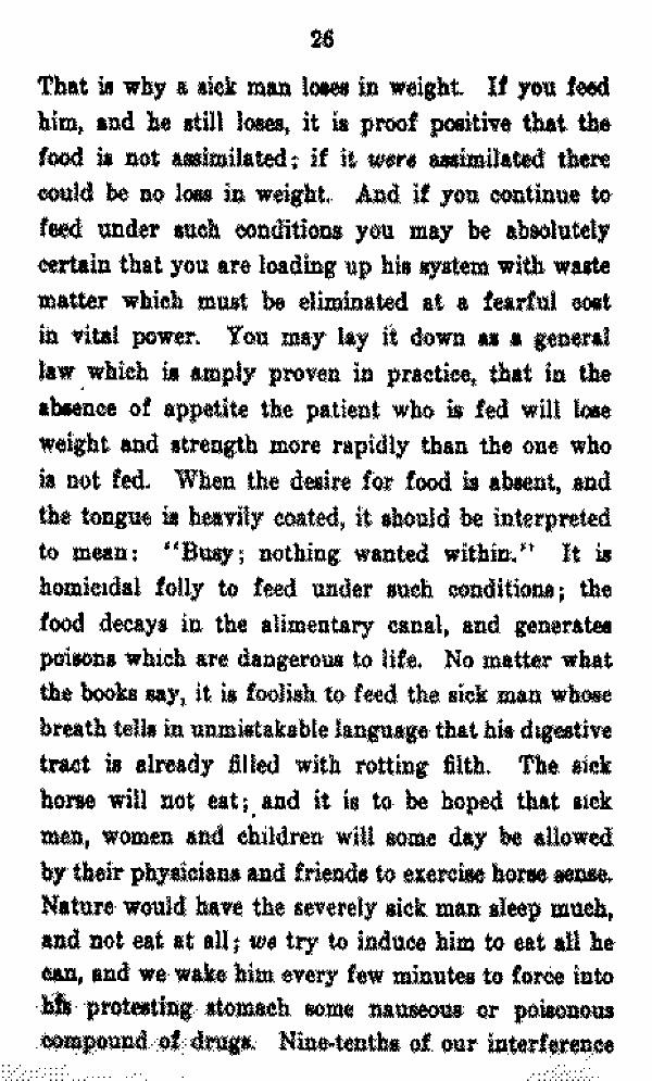 That is why a sick man loses in weight if you feed him, and he still loses, it is proof positive that the food is not assimilated. if it were assimilated there could be no loss in weight. And if you continue to feed under such conditions you may be absolutely certain that you are loading up his system with waste matter which must be eliminated at a fearful cost in vital power. You may lay it down as a general law which is amply proven in practice, that in the absence of appetite the patient who is fed will lose weight and strength more rapidly than the one who is not fed. When the desire for food is absent, and the tongue is heavily coated, it should be interpreted to mean; "Busy; nothing wanted within." It is homicidal folly to feed under such conditions; the food decays in the alimentary canal, and generates poisons which are dangerous to life. No matter what the books say, it is foolish to feed the sick man whose breath tells in unmistakable language that his digestive tract is already filled with rotting filth. The sick horse will not eat; and it is to be hoped that sick men, women and children will some day be allowed by their physicians and friends to exercise horse-sense.