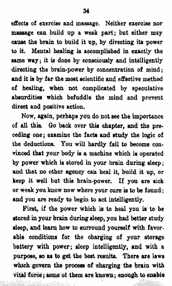 Now, again, perhaps you do not see the importance of all this. Go back over this chapter, and the preceding one; examine the facts and study the logic of the deductions. You will hardly fail to become convinced that your body is a machine which is operated by power which is stored in your brain during sleep; and that no other agency can heal it, build it up, or keep it well but this brain-power. If you are sick or weak you know now where your cure is to be found; and you are ready to begin to act intelligently.