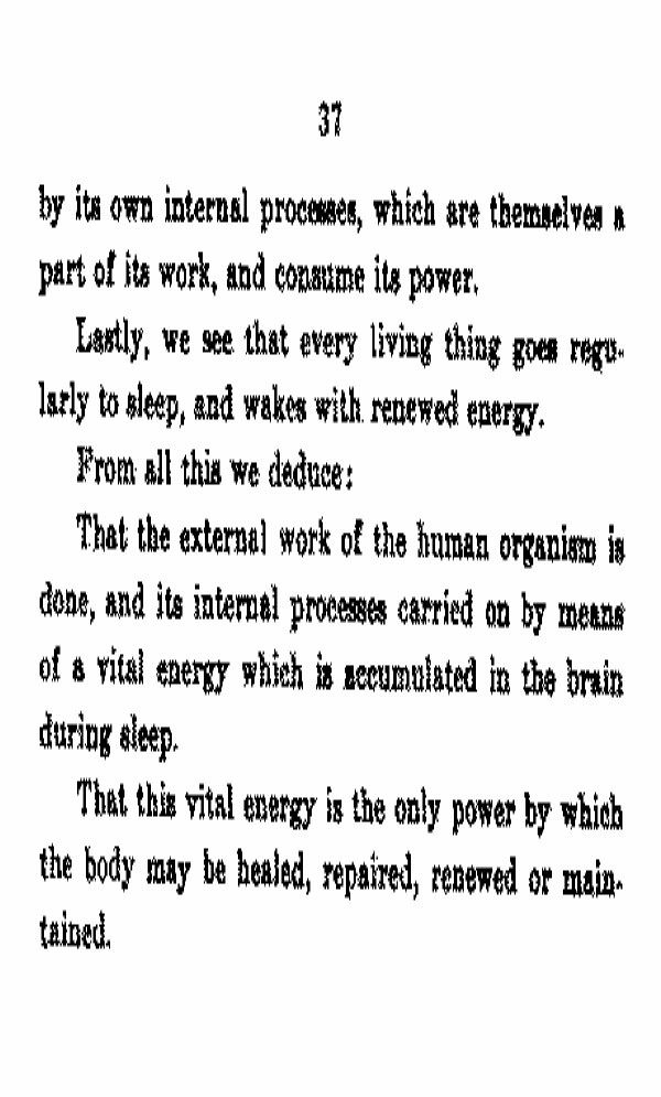 That the external work of the human organism is done, and its internal process carried on by means of a vital energy which is accumulated in the brain during sleep.
