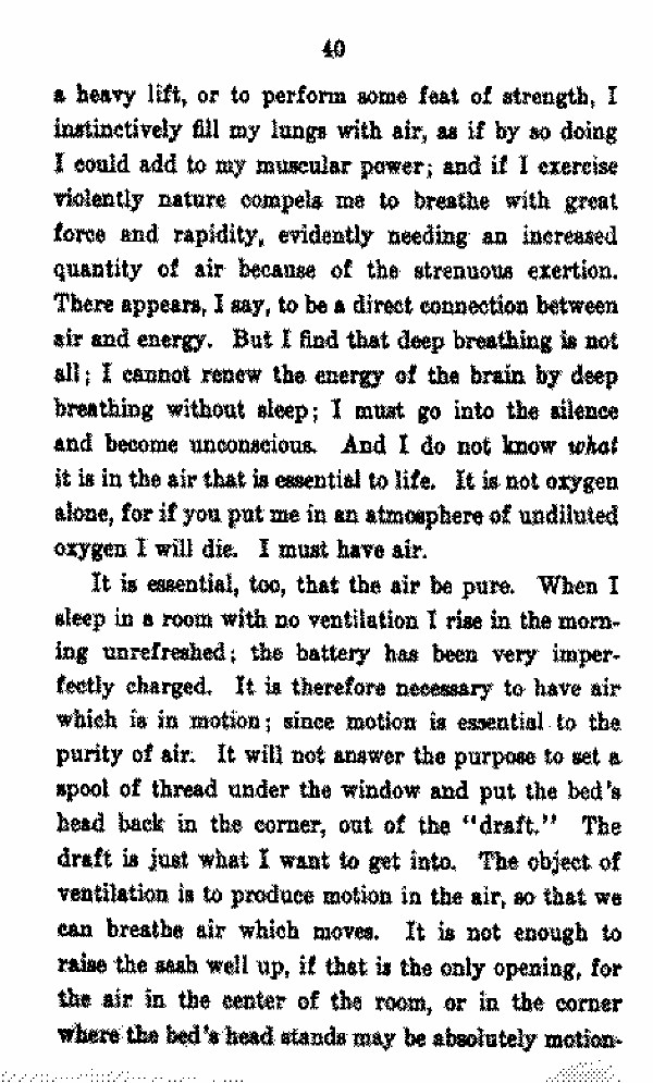 It is essential, too, that the air be pure. When I sleep in a room with no ventilation. I rise in the morning unrefreshed; the battery has been very imperfectly charged. It is therefore necessary to have air which is in motion; since motion is essential: to the purity of air. It will not answer the purpose to set a spool of thread under the window and put the bed's head back in the corner, out of the "draft." The draft is just what I want to get into. The object of ventilation is to produce motion in the air, so that we can breathe air which moves. It is not enough to raise the sash well up, if that is the only opening, for the air in the center of the room, or in the corner where the bed's head stands may be absolutely motionless