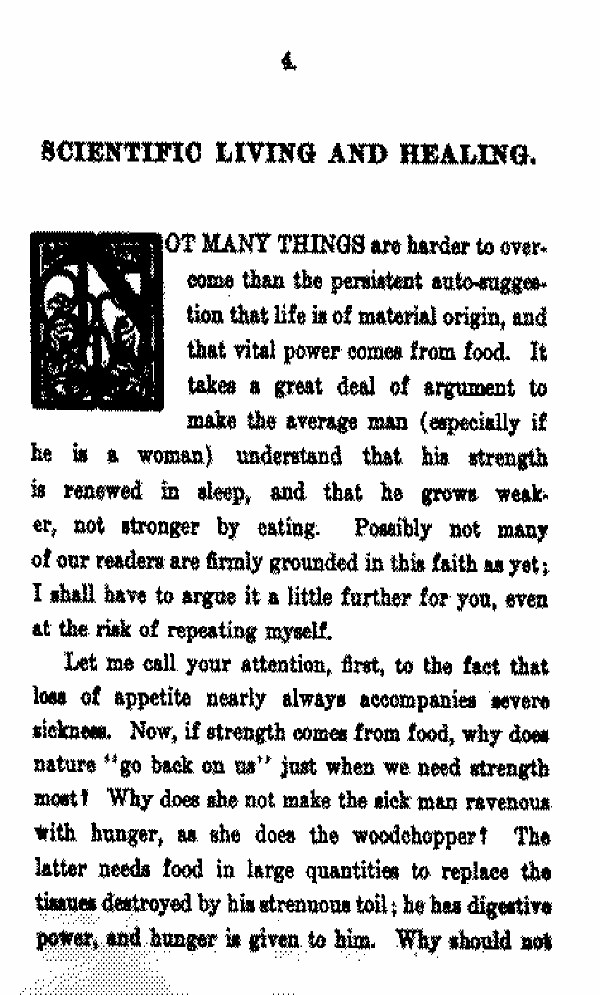 NOT MANY THINGS are harder to overcome than the persistent auto-suggestion that life is of material origin, and that vital power comes from food. It takes a great deal of argument to make the average man (especially if he is a woman) understand that his strength is renewed in sleep, and that he grows weaker not stronger by eating. Possibly not many of our readers are firmly grounded in this faith as yet; I shall have to argue it a little further for you, even at the risk of repeating myself.